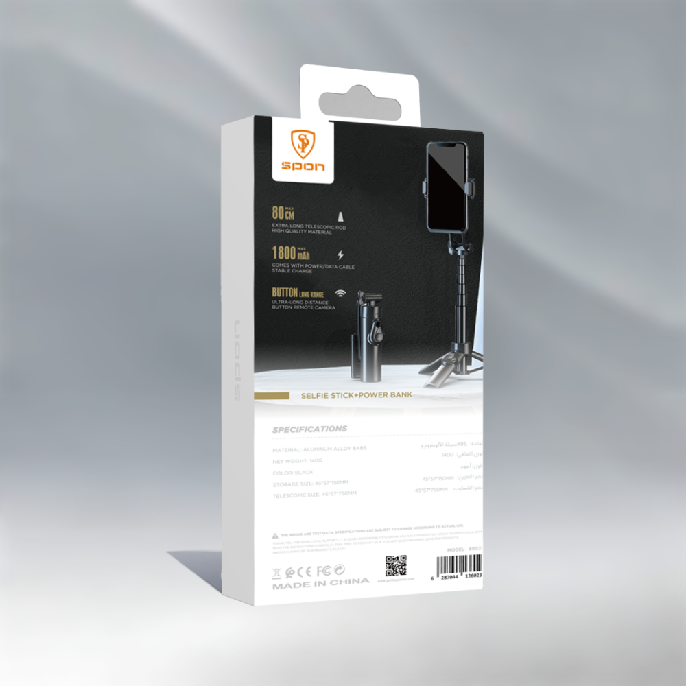استمتع بالتقاط اللحظات المذهلة دون القلق من نفاد البطارية! SPON تقدم لك حلًّا عمليًا يجمع بين عصا سيلفي قابلة للتمديد حتى 80 سم وباور بانك بسعة 1800mAh، لتبقى دائمًا على استعداد لتصوير ومشاركة لحظاتك المميزة.
